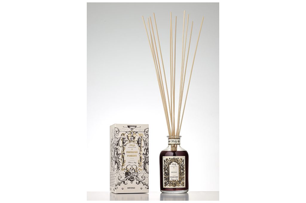 Divino è un profumatore per ambiente in bottiglia in vetro con i bastoncini in midollino. A base di aromi fruttati e persistenti che ricordano i grandi vini nobili, è perfetto per la zona pranzo della casa [Wally 1925, disponibile in 4 diversi formati (100 ml spray, 250 ml, 500 ml, 3 l) da € 19,80].