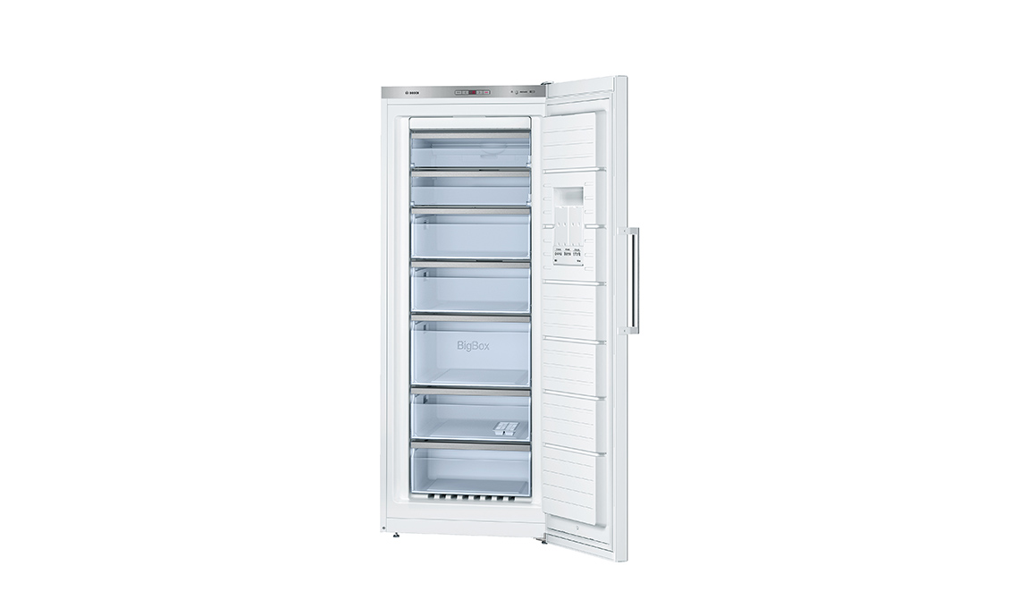 di 323 litri, GSN54AW30 ha la temperatura regolabile visualizzata attraverso display ed è dotato di tasto per congelamento intensivo con spegnimento automatico. In classe A++, ha 7 cassetti [Bosch, cm 70x78x176h €1.149].