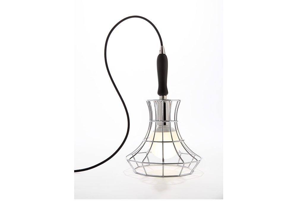 Lampada Lady Cage, da appendere dove si vuole. In metallo cromato e plastica. Design Massimo Rosati [Zava, ø cm 22x37h €207].