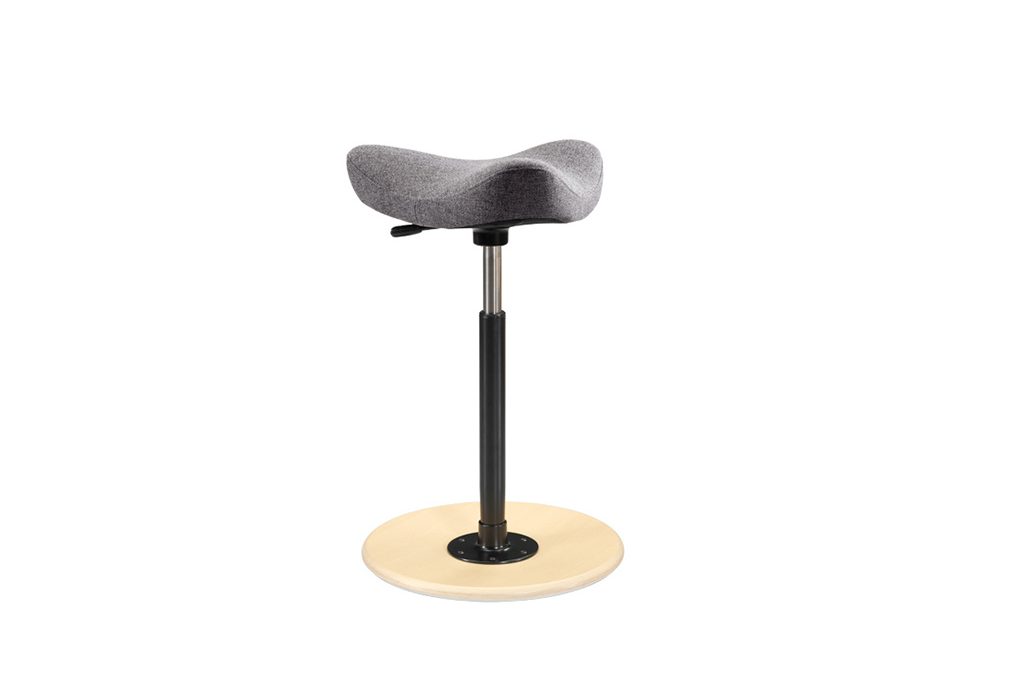 Sgabello con base basculante, seduta a sella ad altezza regolabile [Varier, ø cm 41x56-82h €389].