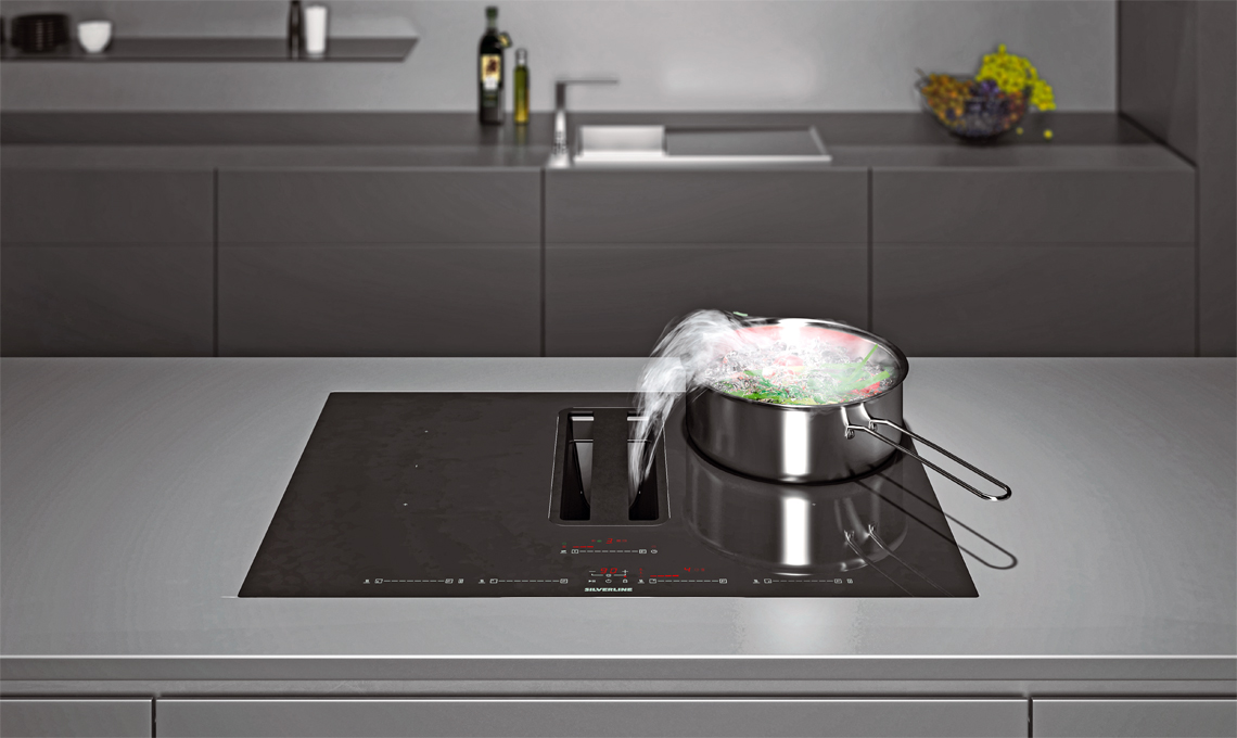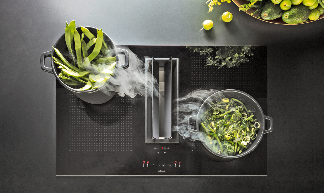 L’aspirazione della cappa integrata è molto efficace perché avviene a livello del piano cottura, impedendo ai fumi e agli odori di disperdersi nell’ambiente.