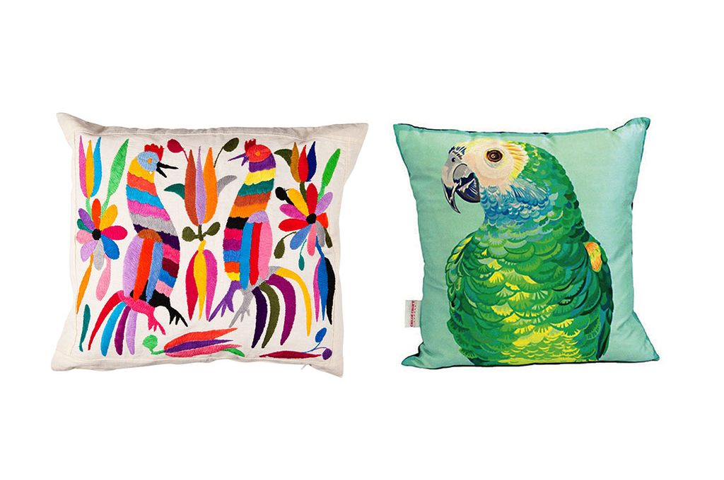 Cuscino con ricami multicolor degli indigeni messicani [Mayalma, cm 50x40 €42,50]. A destra cuscino Parrot Portrait in seta dipinta a mano [Chloë Croft, cm 45x45 €63].