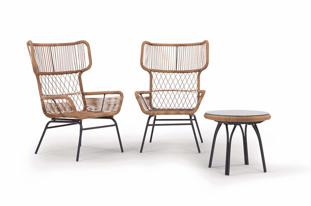 Mood rétro per il set tavolino e poltrone Lyra [Made.com, tavolino con 2 poltrone di cm 68x65x94h €550].