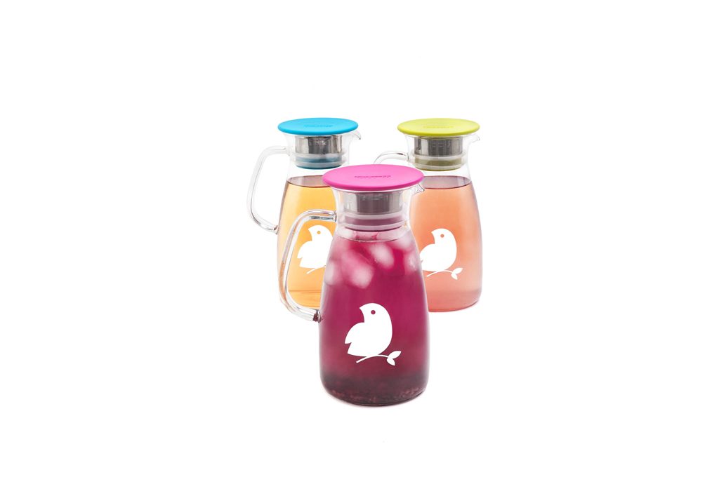 Le Løvely Carafe da 1 litro, in vetro, hanno filtro integrato e coperchio in acciaio per versare (senza far uscire il ghiaccio) le Acque di Frutta estive e altri infusi [Løv Organic].