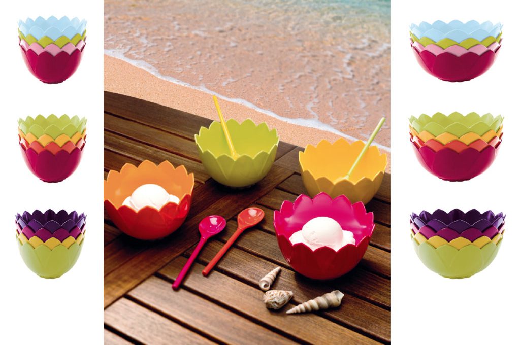 Ciotole impilabili Lotus in melamina colorata [Zak, due formati ø cm 13 €18 il set e ø cm 18 €30 il set].