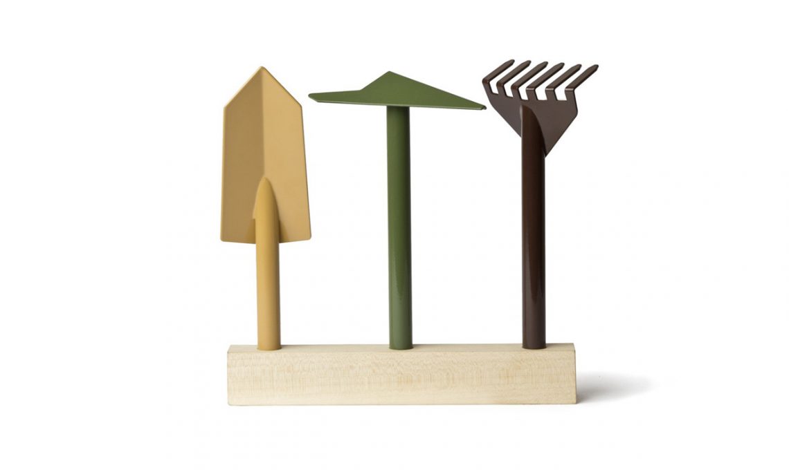 Orte è il set da giardino progettato da Giulio Iacchetti: è composto da una piccola zappa, da un rastrello e una paletta in metallo, dotati di una base in legno, perfetta per tenere gli attrezzi in ordine.