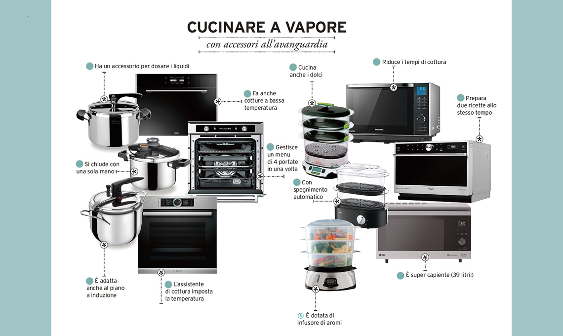 Cucinare a vapore non è stato mai così facile. Grazia a forni, pentole, vaporiere e microonde dotati di accessori all'avanguardia.