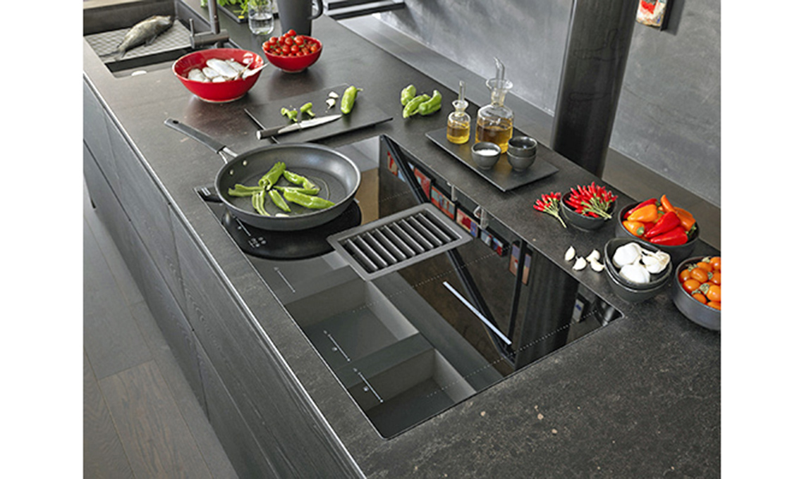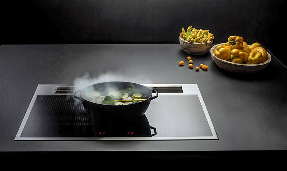 Integrata nel piano cottura, la cappa aspirante Sintesi di Falmec è dotata di flap che si aprono durante il funzionamento, scomparendo e allineandosi in modo perfetto al piano dopo l’uso. Attraverso il Dialogue System, con controllo touch. controlli tutte le funzionalità della cappa direttamente dal piano cottura. Il dialogo tra piano e cappa avviene tramite radiofrequenza.