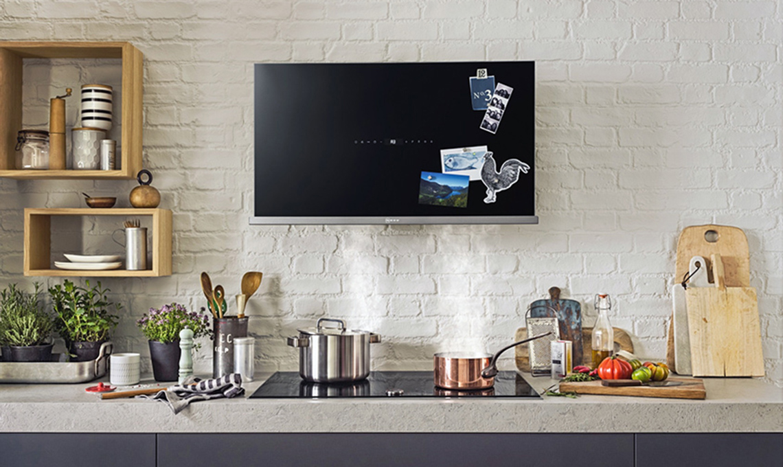 Con i comandi del piano cottura a induzione Flexinduction T59TS5RN0 Neff, accendi, spegni, aumenti o diminuisci la potenza di aspirazione anche della cappa, senza distogliere l’attenzione da quello che stai cucinando. Merito del comando magnetico TwistPad® Fire. La cappa DesignCreative, compatibile, ha superficie magnetica e scrivibile, per gli appunti.