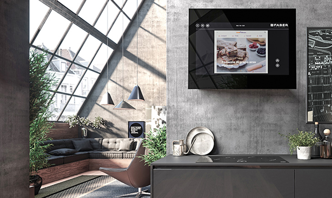 La cappa K-Air di Faber ha sensori che monitorano il livello di temperatura, umidità, composti organici volatili e gas per tenere sotto controllo la qualità dell’aria. Basta un semplice tocco per connetterla allo smartphone per vedere direttamente dallo schermo della cappa foto e video o verificare lo stato dei filtri. Puoi connetterti a internet e avere a tua disposizione un vero e proprio cooking assistant, grazie a una partnership con Giallo Zafferano.