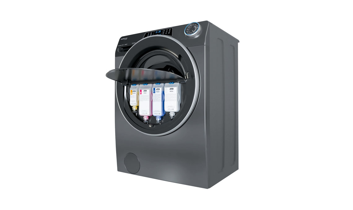 Combinazione personalizzata. La lavatrice di [Haier] che vedi sotto a destra ospita 4 flaconi di detergenti che, grazie all’intelligenza artificiale, si mescolano da sé, a seconda della quantità di bucato, della tipologia dei tessuti e del livello di sporco.
