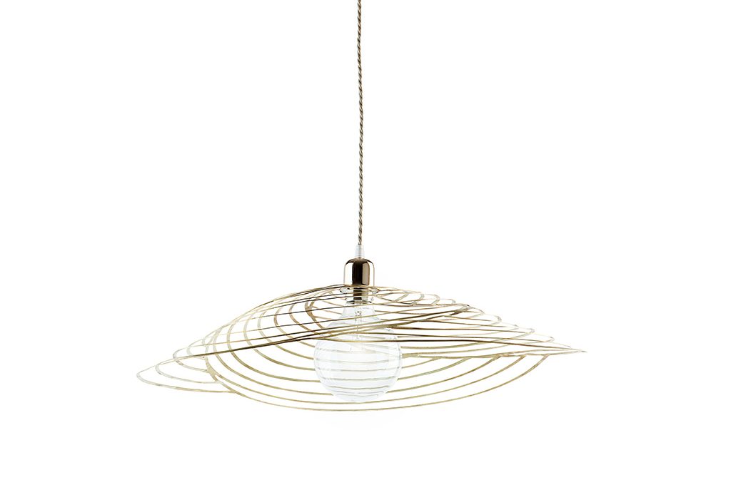 Poetico il lampadario Buzz, in ottone traforato, di Tord Bontje [Established & Sons, Ø cm 50x45h, prezzo su richiesta].