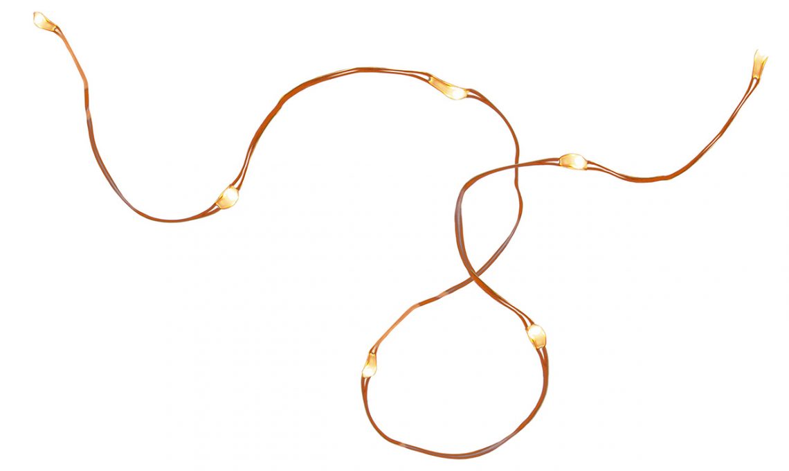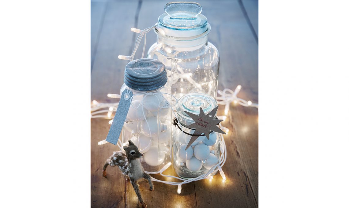 • In quello grande inserisci una porzione del filo di lucine e fallo fuoriuscire, facendolo girare attorno alle basi di tutti e tre i barattoli.