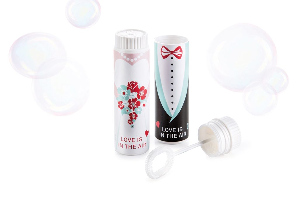 Divertente la ‘coppia’ di bolle di sapone che, distribuite agli invitati, potrebbero sostituire il lancio del riso [Design3000 €5,95]