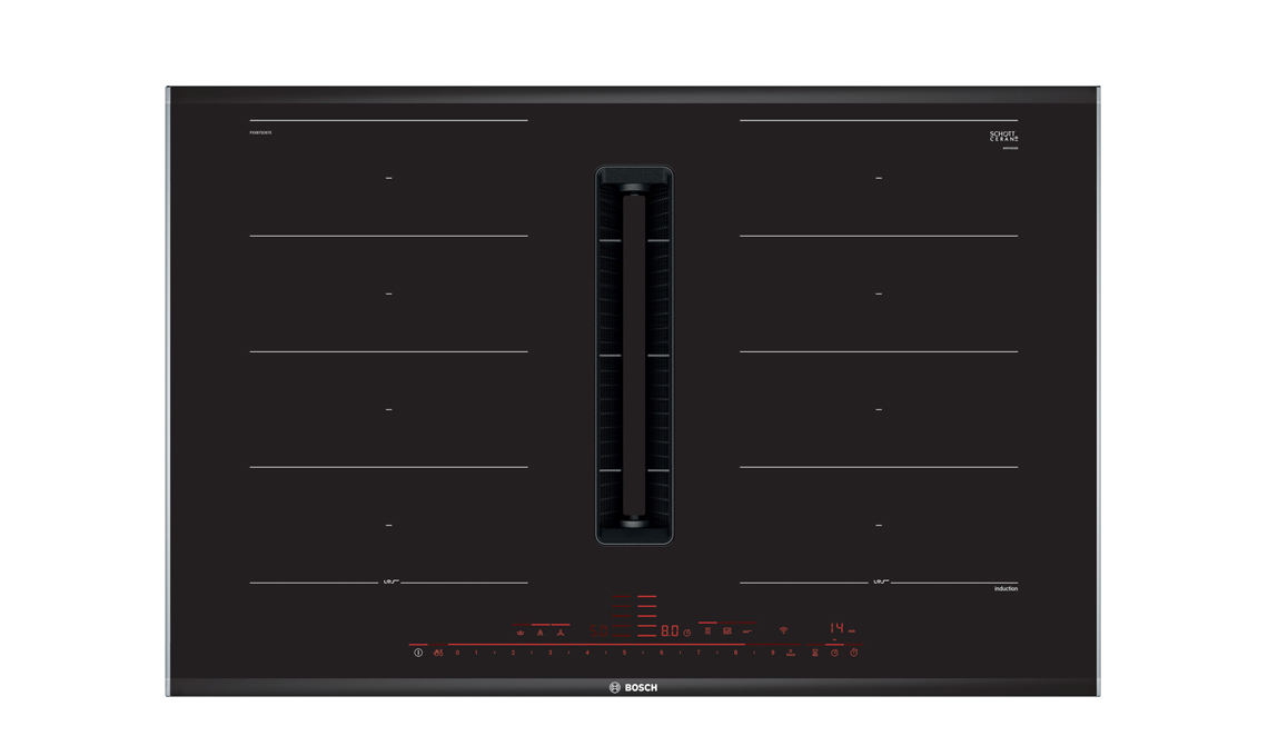 Il controllo automatico delle potenze nel piano con cappa integrata Serie 8 PXX875D67E ti permette la massima efficacia di aspirazione, con consumi ridotti [Bosch, largo cm 80]