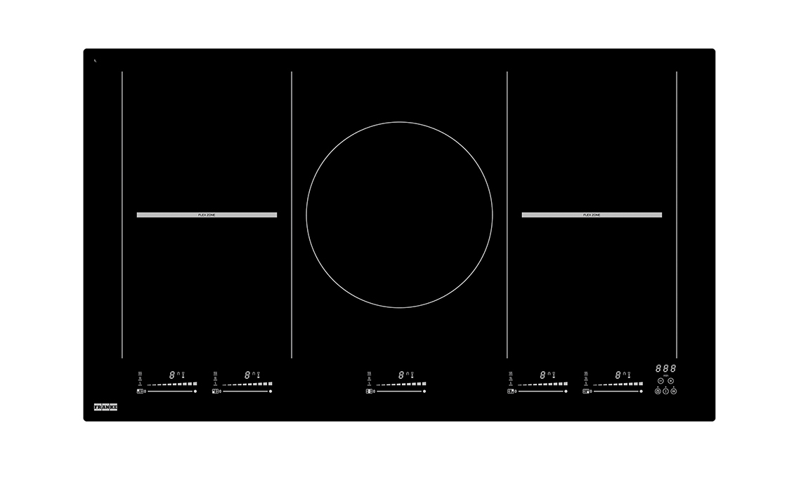 Piano cottura a induzione Mythos FHMT 905 1I 2FLEXI da cm 88x52 con sliding touch control, regolazione progressiva da 1 a 14, riconoscimento automatico della pentola, 4 piastre 2100W + 1 piastra 3700W (diametro 26cm) - zona Booster 5500W, assorbimento totale 11.1 KW. Funzioni automatiche: stop&go – scalda vivande – bagnomaria – cottura delicata [Franke].
