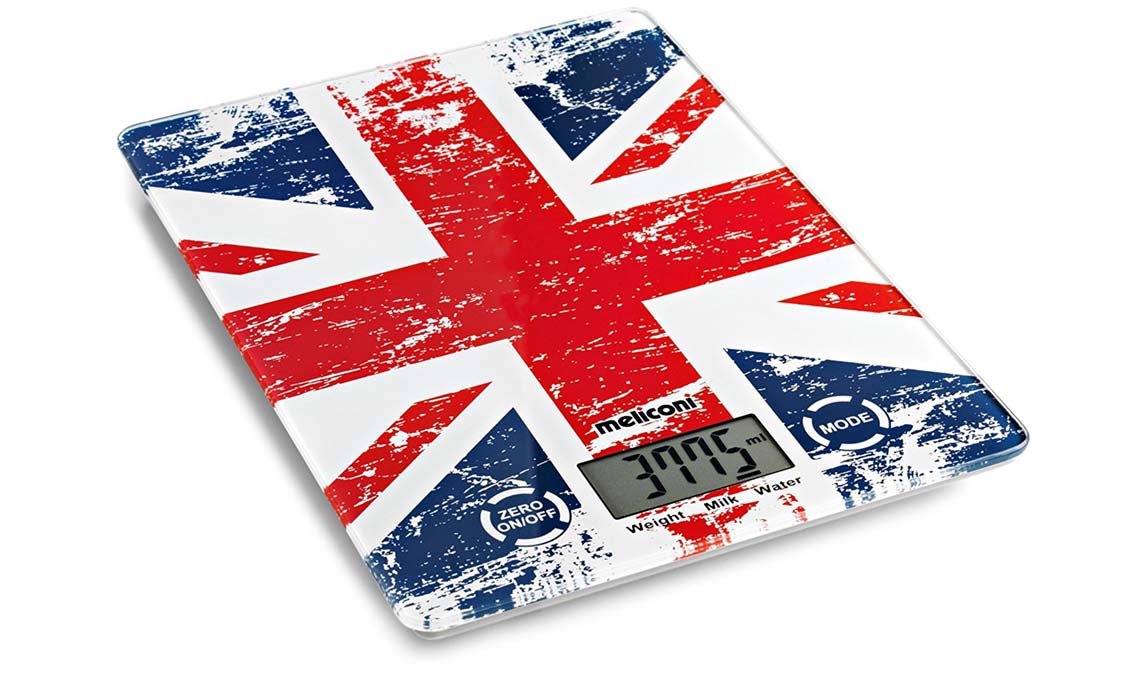 La bandiera inglese come icona vintage su una bilancia dall'attitidine tutt'altro che antica: tasti touch, spegnimento automatico, funzione volume latte per misurare i liquidi. Portata massima: 5 kg