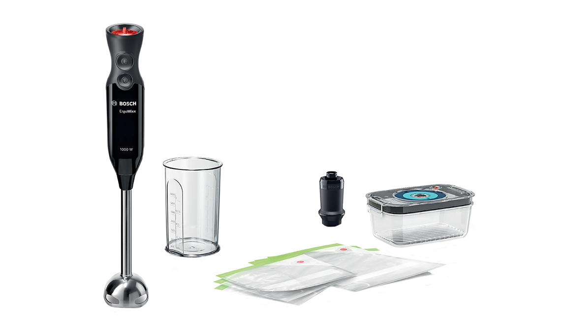 Con il modello a immersione ErgoMixxe puoi mettere le tue preparazioni sottovuoto in un contenitore, o in sacchetti per cuocere sous-vide [Bosch € 129,90].