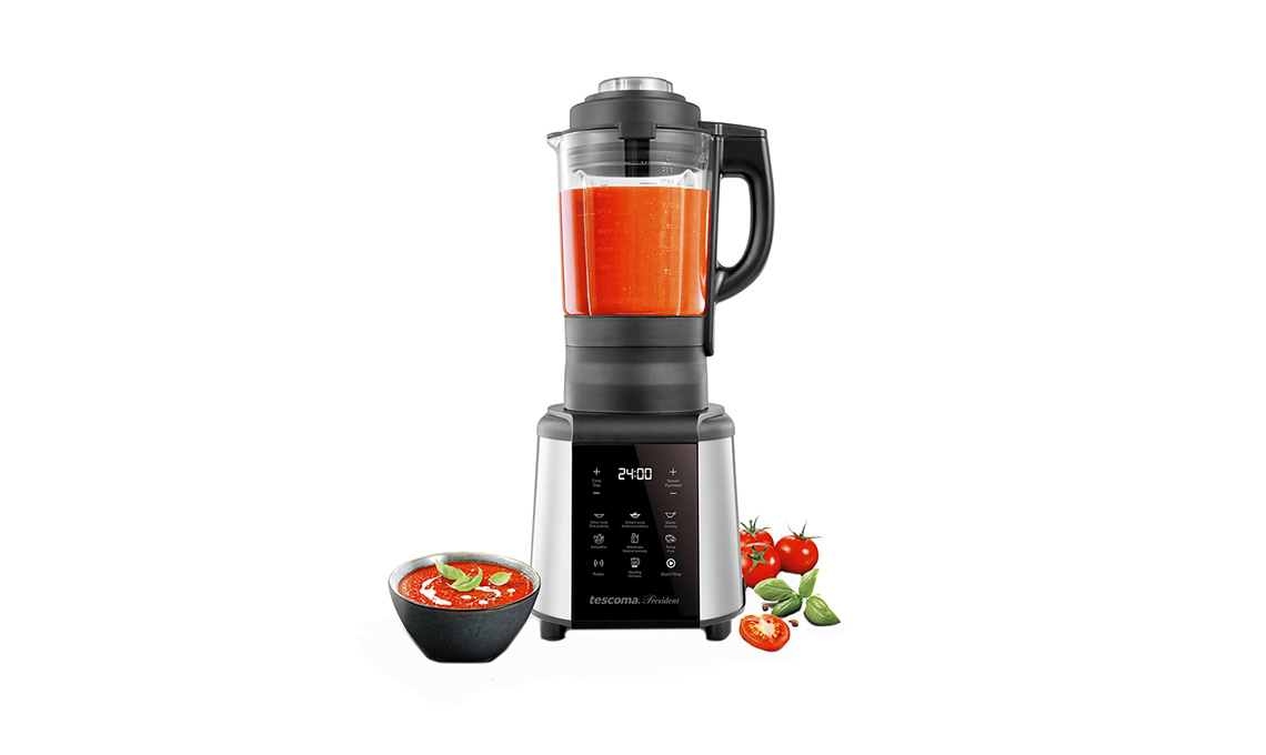 Il frullatore della Linea President ha programmi per brodo, zuppa, purè e frappé. Boccale da 1,75 litri in vetro, lame in acciaio e potenza fino a 950 watt [Tescoma € 249,90].