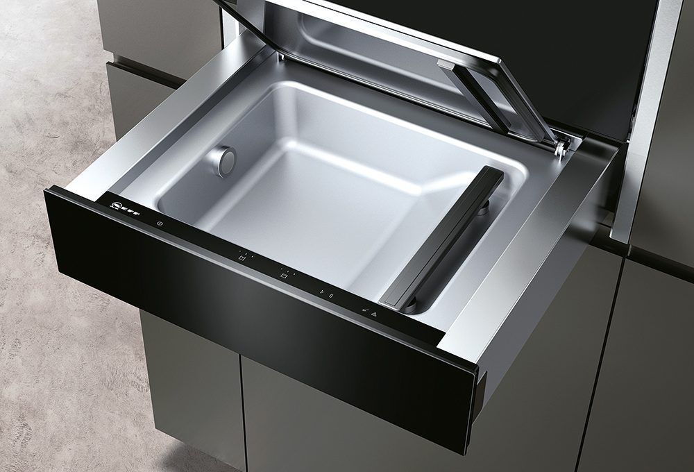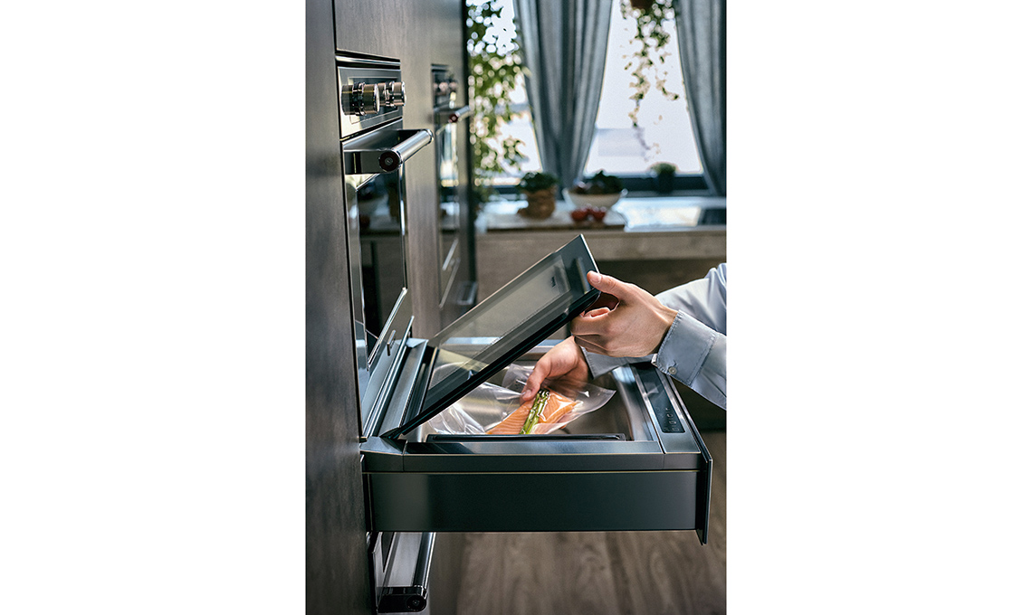 ‘a campana’ da incasso sta nella colonna forno. La macchina da incasso Chef Touch, alta solo 14 cm, sigilla gli ingredienti in sacchetti pronti per essere