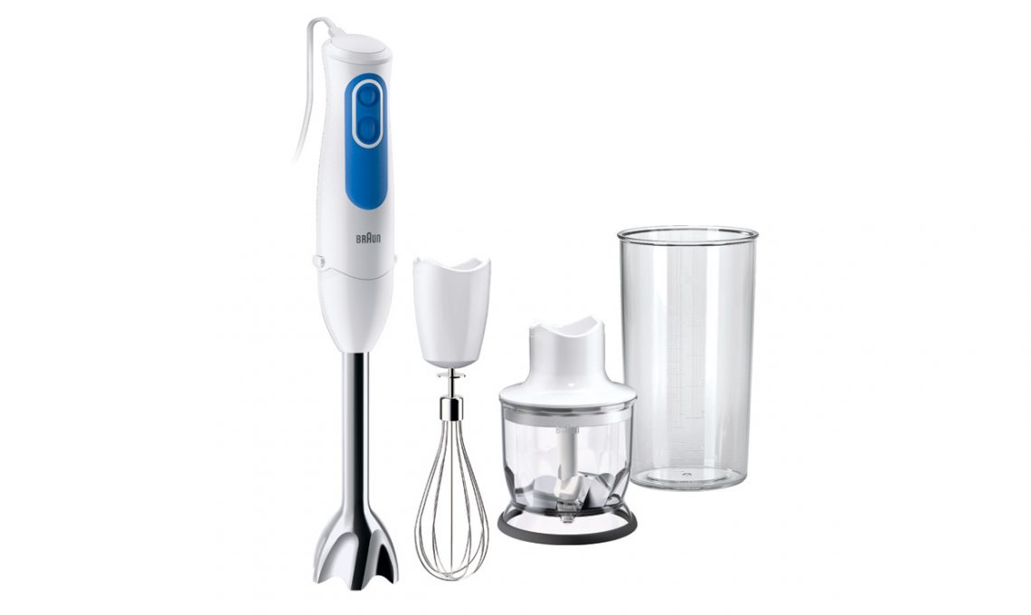 Il Minipimer MQ3025 Spaghetti ha tecnologia di miscelazione anti-schizzo, potenza 700 watt, due velocità, bicchiere in plastica da 600 ml, minitritatutto da 350 ml e frusta a filo [Braun € 70].
