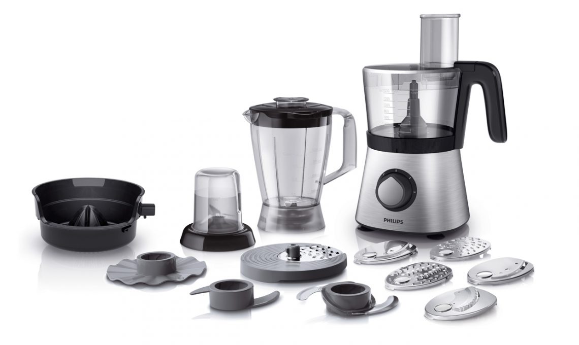 Il robot Viva Collection è un sistema 4 in 1 con recipiente da 2,1 litri, frullatore da 1,75 litri, tritatutto e spremiagrumi e con numerosi accessori per più di 30 funzioni (affettare, sminuzzare, grattugiare, tagliare a julienne...) [Philips €136,99].