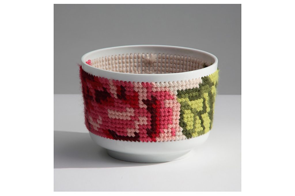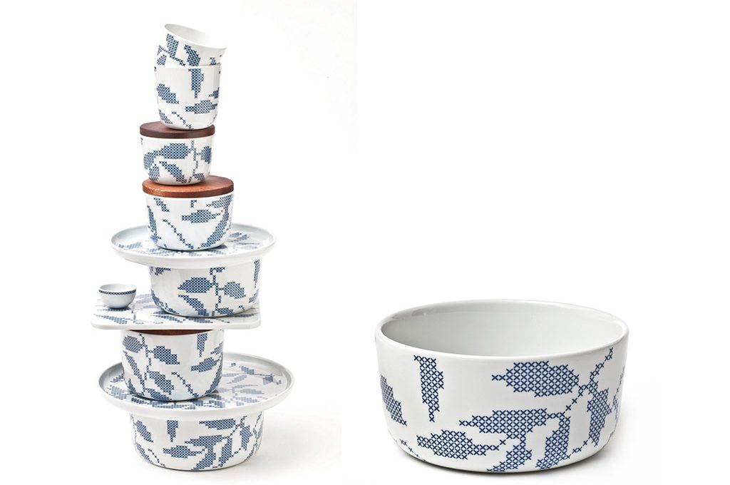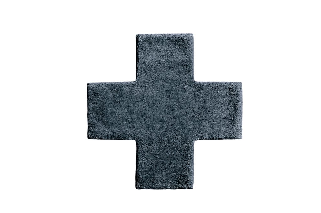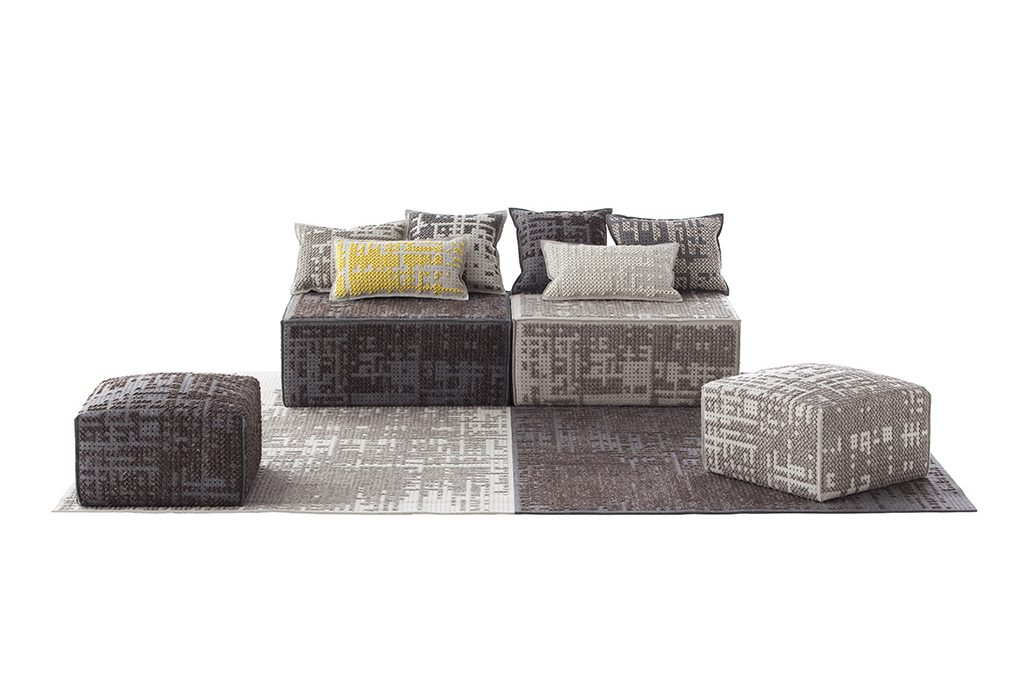 Punto croce in chiave design nella collezione Canevas di Charlotte Lancelot, con tappeti, cuscini, e pouf modulari [Gan, il pouf cm 100x70x42h].
