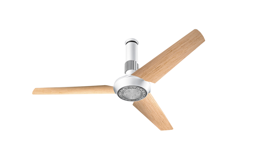 - Personalizzabile nelle pale (qui in fibra di carbonio e rovere) e nel corpo motore e sospensione, Nordik© Air Design, da soffitto, ha 3 velocità (regolabili con telecomando) e luce a Led a 5 intensità [Vortice].