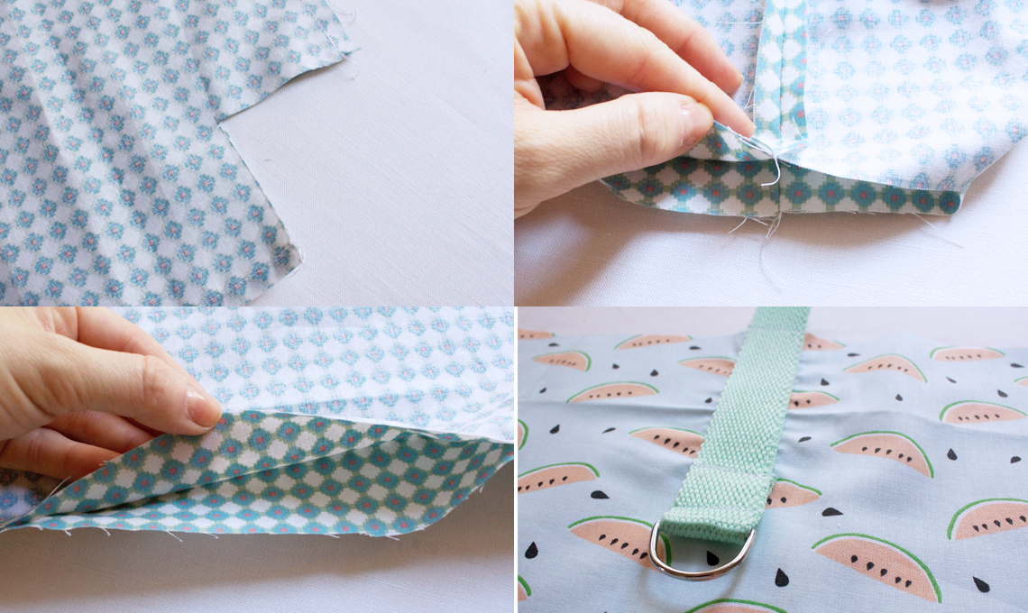 - Tagliate 16 cm di tessuto per manici, piegate a metà e inserite due anelli per nastro.