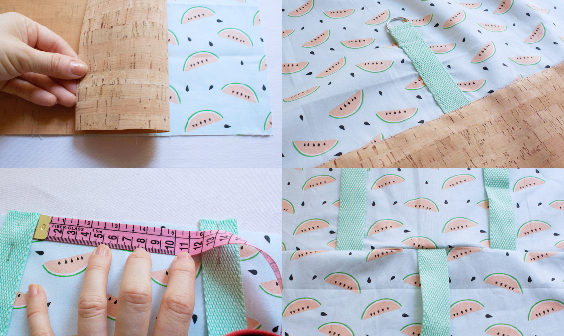 - Ora iniziamo ad applicare il sughero per il fondo. Appaiare il dritto del tessuto con la parte dritta del sughero e cucire.
