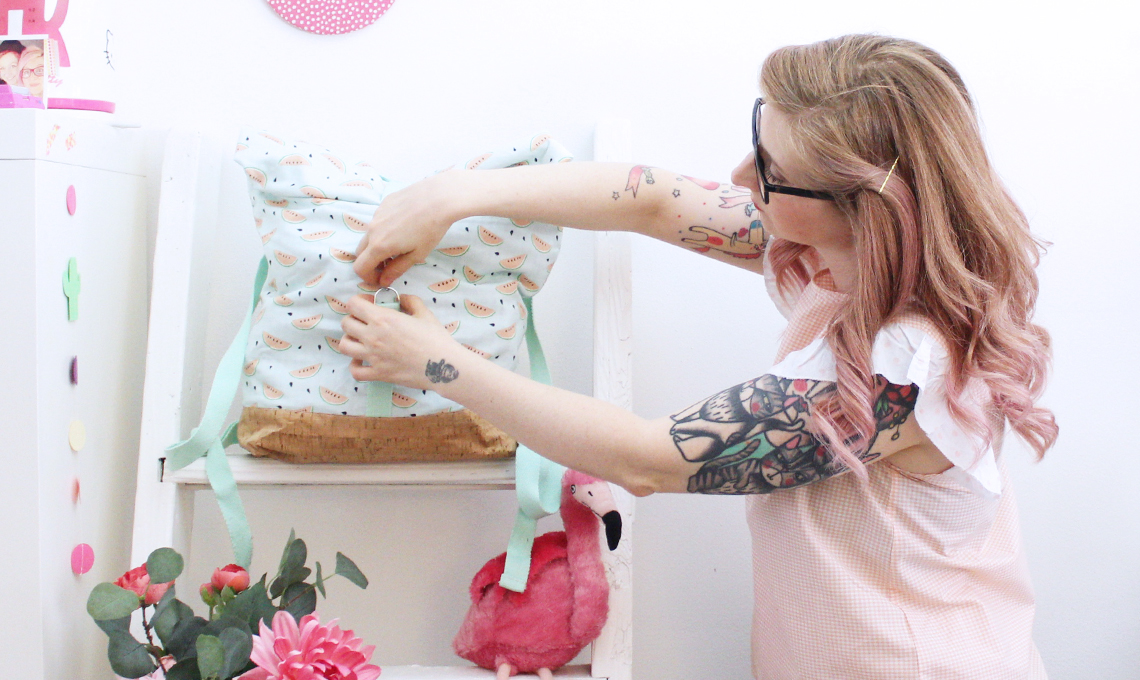 Il trucco in più: se volete creare un finto soffietto, stirate bene i lati dello zaino come se fosse una busta del pane e poi fissate con un paio di punti a mano il soffietto che si creerà all’apertura dello zaino.