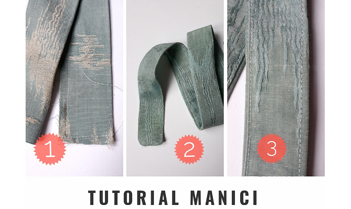 1) piegare nel senso della lunghezza le strisce, dritto contro dritto, e cucire tre lati, lasciando aperto uno dei lati corti per rigirare il lavoro.