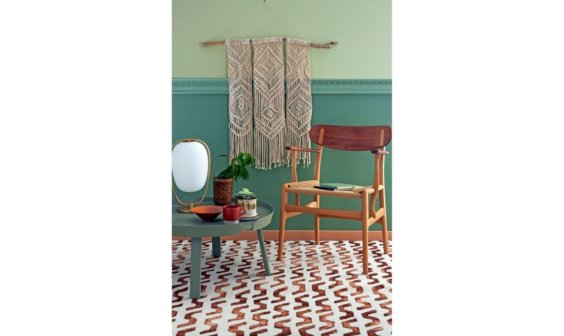 Sedia CH26 Lounge Chair [Carl Hansen & Son], tappeto Volare [G.T.Design]. Sul tavolino Around [Muuto, su designrepublic.com]: mug [Nanban]; piantina, ciotola di legno e vasetto ntrecciato [Tenoha]; lampada Lannà [Kundalini]. Pareti dipinte con vernici Green Transition e Green Trail [Wilson & Morris].