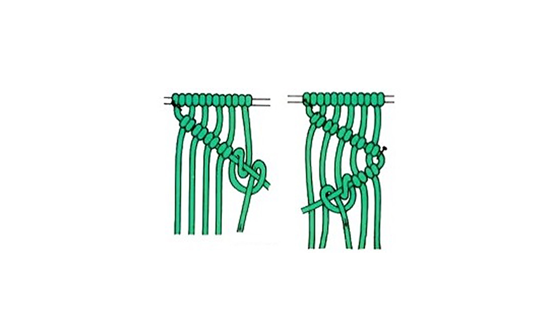 Con i nodi di avvio fissa al ramo 16 cordoncini di 3,5 m piegati a metà. Salta 2 fili e annoda a sinistra 3 nodi piatti, 3 nodi piatti sotto, salta 1 filo e annoda 2 nodi piatti, 2 nodi piatti sotto, salta un filo, annoda 1 nodo piatto e 1 nodo piatto sotto. Ripeti la sequenza a destra.