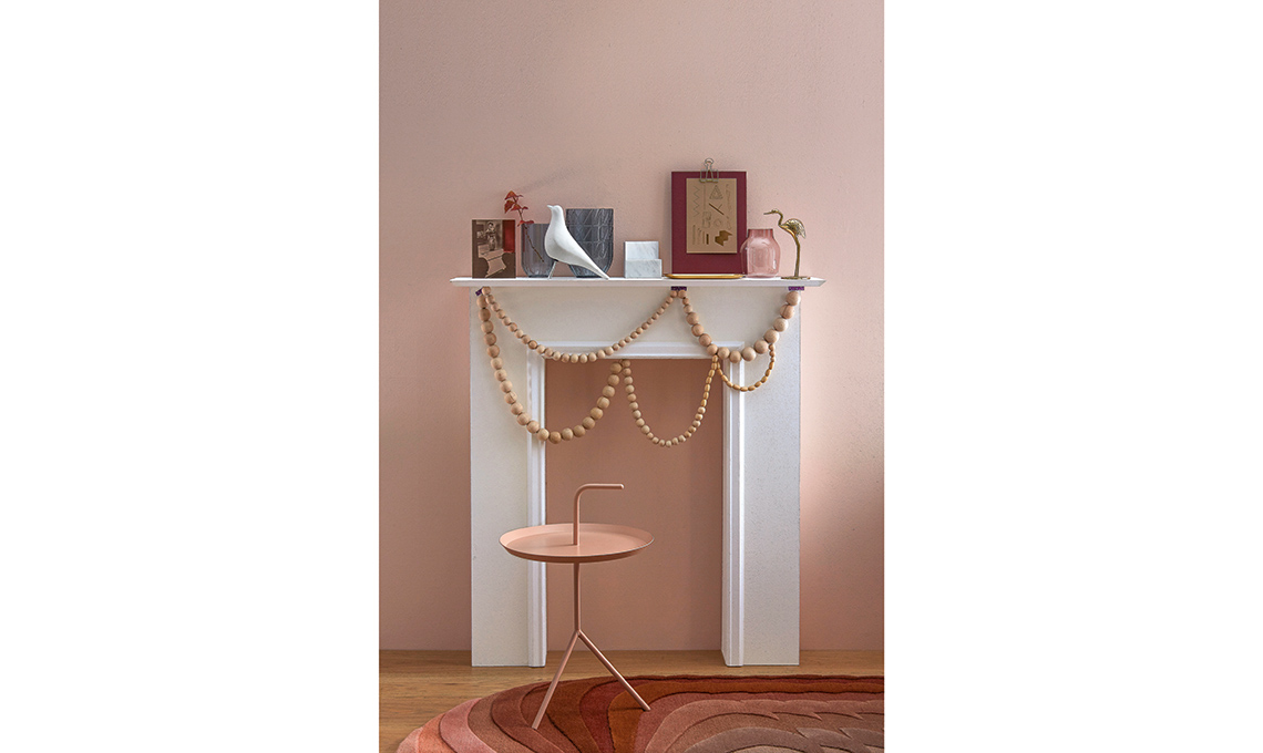 Rubano la scena le perle di legno che sfilano in lunghe collane sul caminetto decorativo. Un’idea da copiare anche per mensole o cornici.
