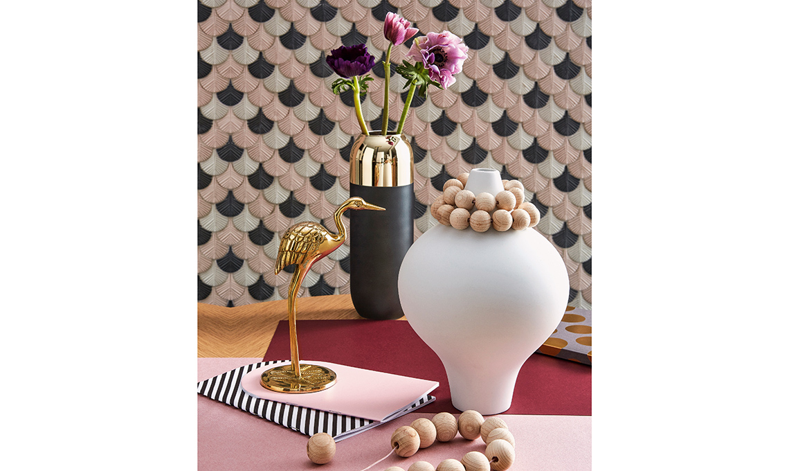 Tavolino Don’t Leave Me cipria, vasi Colour Vase blu polvere e vassoietto Tray ovale dorato [Hay, su designrepublic.com], tappeto Slinkie [cc-tapis], statuetta decorativa dorata a forma di gru [Zara Home].