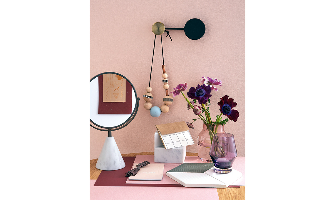 Caffettiera Lady Anne [KnIndustrie], caraffa Beak viola [Nude], piattini, tazza, bicchiere, tovagliolo e cucchiaino [Zara Home], penne e clip oro [Hay, su designrepublic.com].