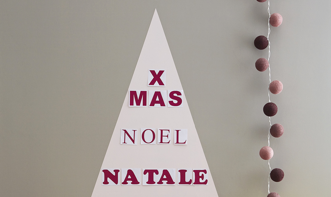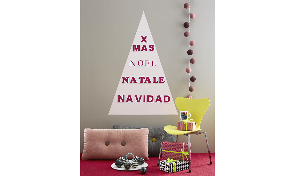 Chic e glam. Il rosa cipria è il colore protagonista del maxi albero grafico dipinto a tutta parete. E gli auguri? Scrivili sull’albero!