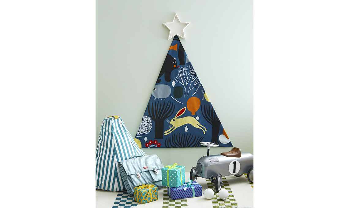 La parete è dipinta con il colore Fleur Miami Milk [TO-DO]. Per l’albero, tessuto Marimekko [Jannelli & Volpi Store]. Tappeto Arkad [Kasthall], macchinina [De Padova], poltrona a sacco e cartella [Le civette sul comò]. Carte da regalo [Tiger].
