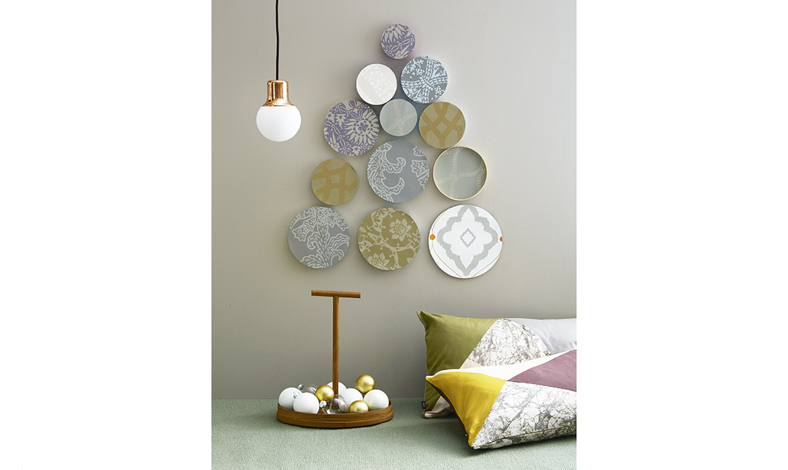 Tinte polverose e bagliori di luce vestono l’albero dedicato alle amanti della carta da parati. Le tele rotonde da pittore o le vecchie scatole rivestite disegnano la silhouette dell’albero. Chic!
