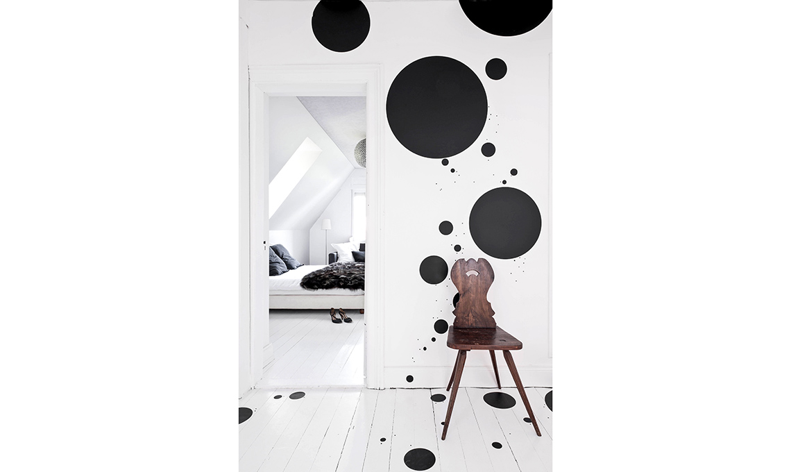 1. Disegna sul retro della plastica adesiva nera opaca D-C-fix [Hornschuch] dei cerchi di diametri diversi. Ritagliali e fai a parete una prova di composizione, fissandoli con il nastro adesivo in carta, in modo che l’ordine sembri casuale.