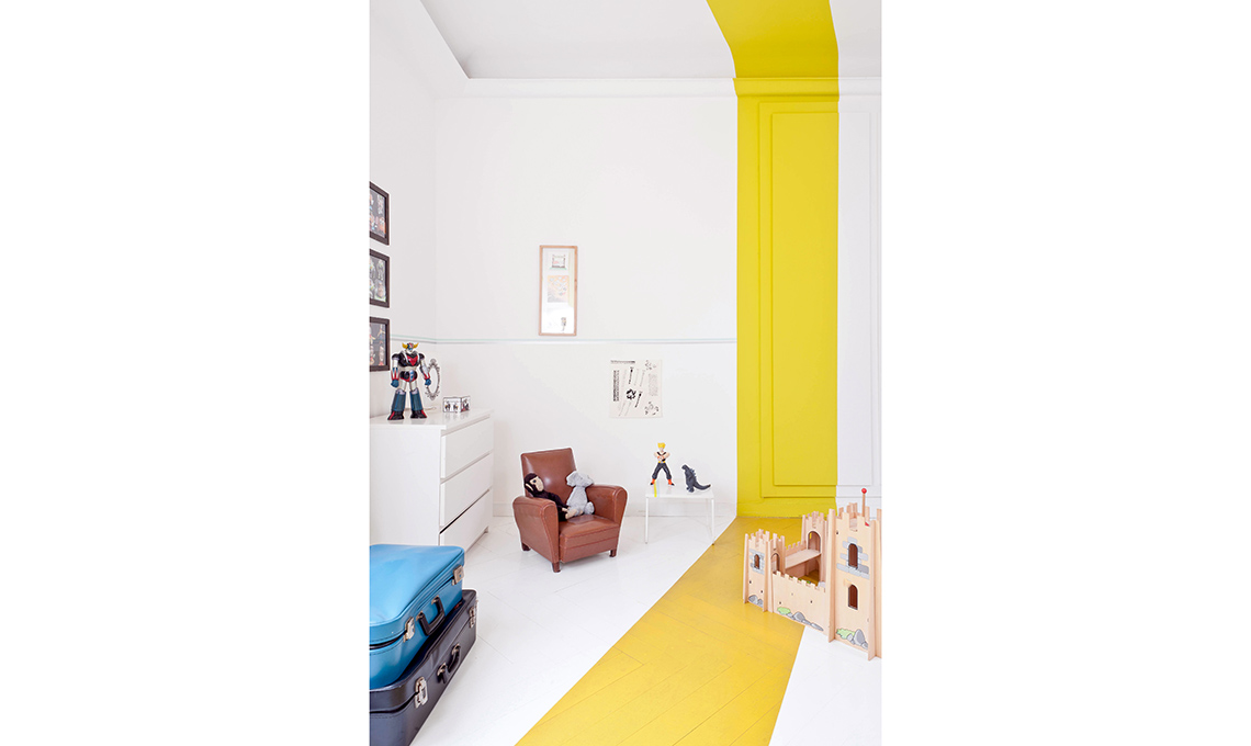 2. Partendo dal centro del soffitto fissa il nastro Masking [Fabo, cm 5x25m €5,40]: fallo arrivare alla parete e scendi lungo la stessa, aiutandoti con un metro laser perché la linea sia diritta.