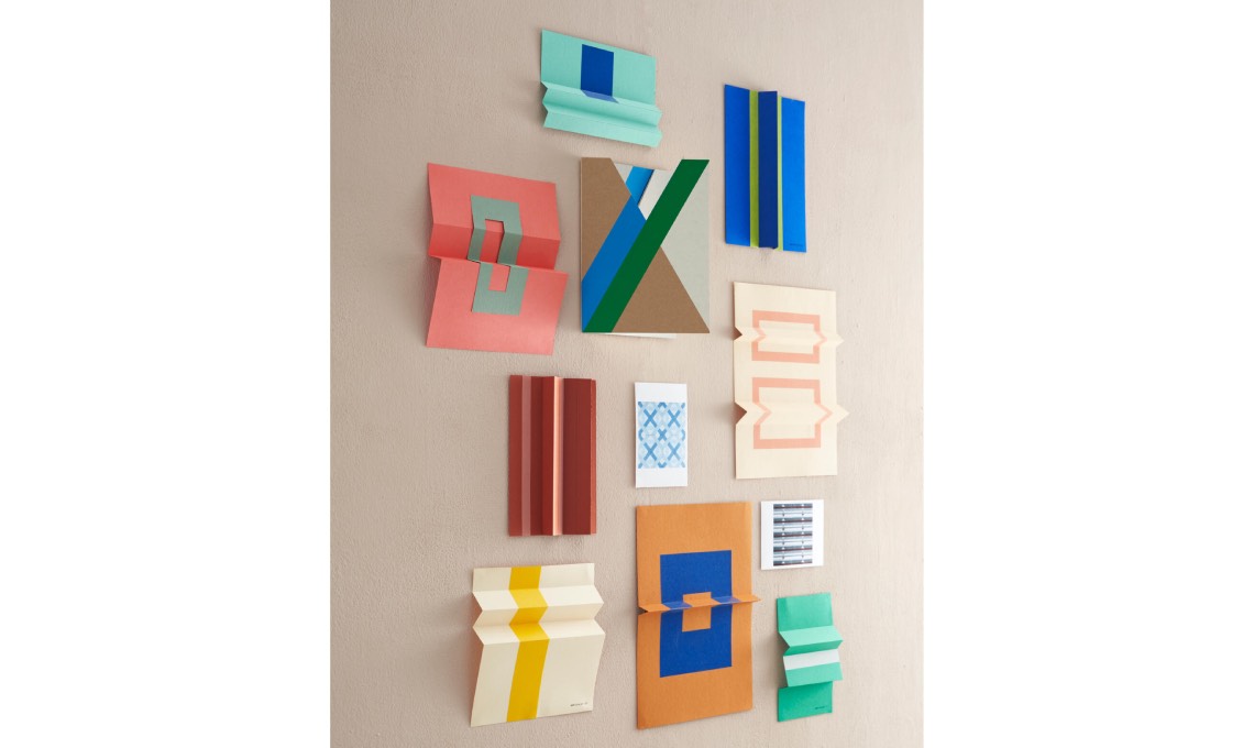 Abbina i cartoncini per creare la tua palette colori e fai una prova di composizione. Con la matita e il righello segna dove realizzare le piegature dei cartoncini. Con un cutter ben affilato e un righello di metallo incidi leggermente il cartoncino. Non devi tagliarlo, ma solo segnare la piega. Ora realizza combinazioni di pieghe a monte e a valle e decora con i washi tape. Infine fissa i cartoncini alla parete con la gomma adesiva.