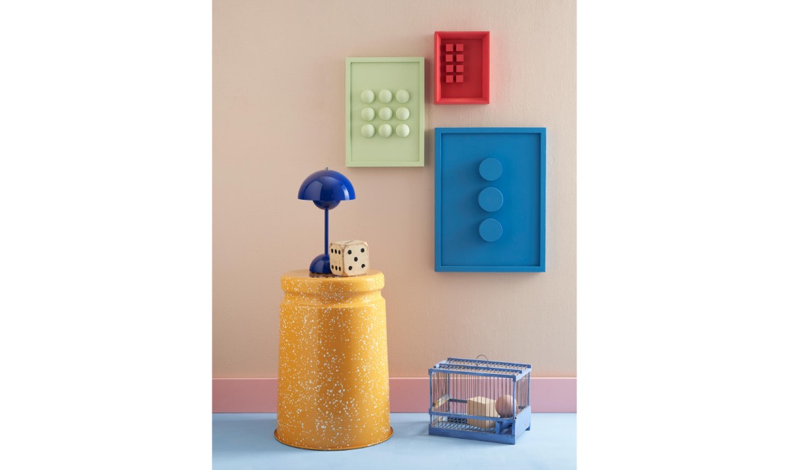 Per i quadri geometrici in 3D: sgabello Last Stool in acciaio smaltato giallo puntinato [Hem, da Design Republic, ø cm 28x44h]. Lampada da tavolo portatile Flowerpot VP9