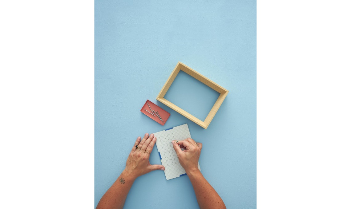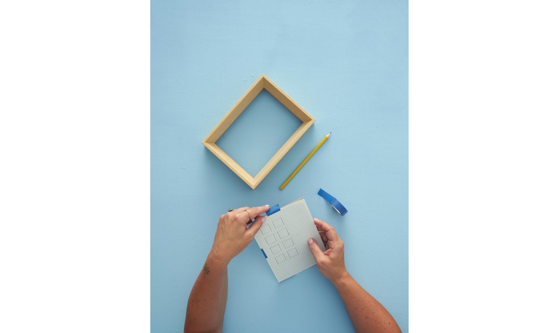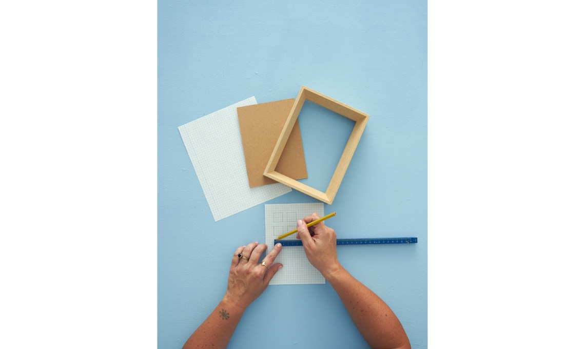 1. Taglia il foglio in misura del supporto della cornice e disegna la posizione dei cubetti.