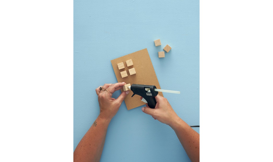 5. Con la colla a caldo fissa i cubetti al supporto. Schiaccia bene in modo che la colla faccia presa.