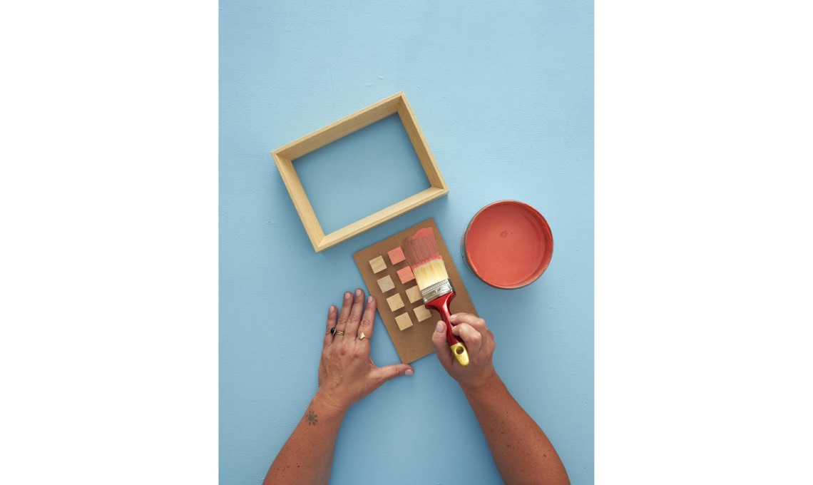 6. Con il colore acrilico dipingi il supporto con i cubetti e tutta la cornice. Dai 2 o 3 mani per un risultato coprente e uniforme.