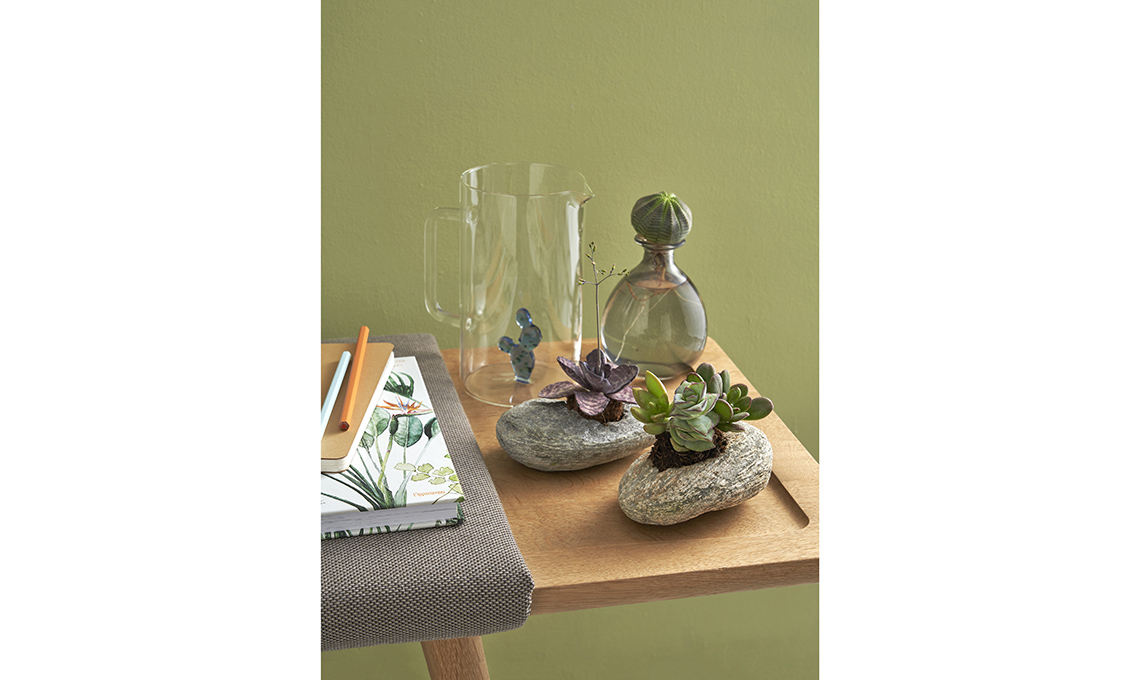 È l’idea décor per gli amanti del fai-da-te... estremo: con una punta del trapano grossa scalfisci la pietra, poi posiziona la punta a 90° sul sasso e inizia a perforare, prima con una velocità ridotta per poi aumentare gradualmente. Non devi trapassare il sasso, ma creare un avvallamento dove posizionare la piantina. Non hai il trapano? Crea un sasso con la pasta modellabile effetto pietra, indurente all’aria [Das Stone].