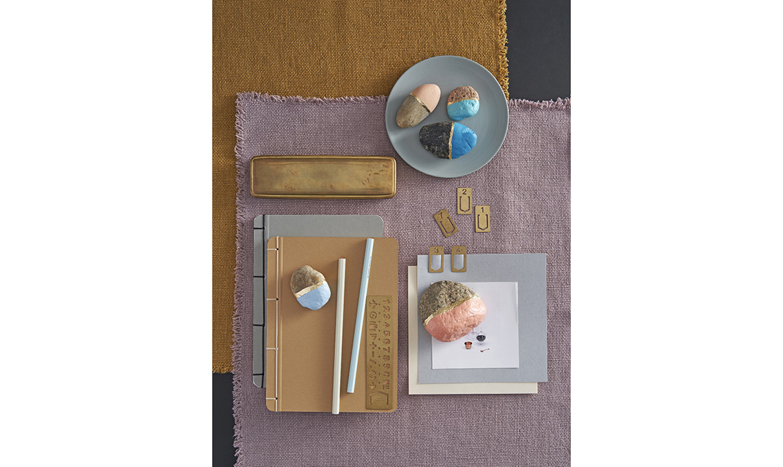 Con i colori acrilici puri, dipingi i sassi con pennellate di colore: a mano libera, o con una mascheratura con il nastro adesivo per un contorno netto. Il tocco prezioso è l’inserto in foglia oro: con il pennello stendi la missione, lasciala asciugare per 15 minuti, applica la foglia oro, spolvera l’eccedenza col pennello asciutto.