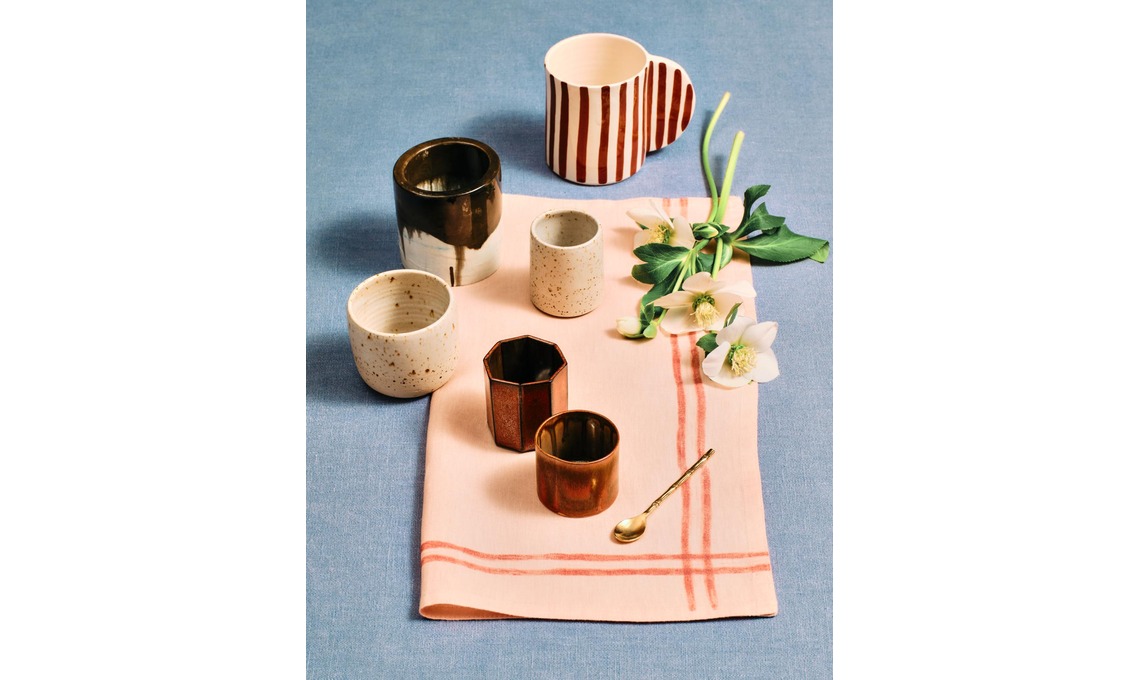 IDEA 4: CON UN TIMBRO. Tazzine pietra del Doge di @vs_ceramics e vasetto bicolore ‘Cose Concrete’ [tutto da Emporio Mikica]. Mug a righe e cucchiaino [PalermoUno], tazzine in grès smaltate a immersione [Atelier Chaubet].